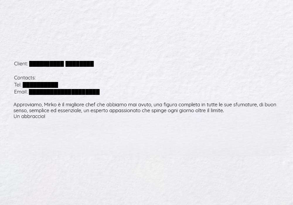 A chi di dovere, Raccomando vivamente Mirko come chef privato. Ha lavorato per me per due settimane e ha superato le aspettative con le sue capacità culinarie e la sua professionalità. Mirko è esperto in una varietà di piatti, dai dolci alla pasta, e prepara perfettamente sia la carne che il pesce. I suoi piatti erano sempre perfettamente cotti e conditi, a dimostrazione della sua maestria. Mirko è anche altamente professionale, mantenendo la pulizia e l'organizzazione in cucina. È stato rispettoso, flessibile e accomodante nei confronti delle esigenze dietetiche e ha dimostrato un impegno a ridurre al minimo gli sprechi di cibo. Mirko eccelle nella creazione di piatti sani e saporiti, con una forte comprensione della nutrizione. I suoi piatti erano ben equilibrati e ben presentati, elevando l'esperienza culinaria. In sintesi, le capacità culinarie, la professionalità e l'adattabilità di Mirko lo rendono una scelta eccellente per chiunque cerchi uno chef privato. Lo assumerei volentieri di nuovo. Non esitate a contattarmi per qualsiasi ulteriore informazione. Cordiali saluti, ████ ██████ ███ .